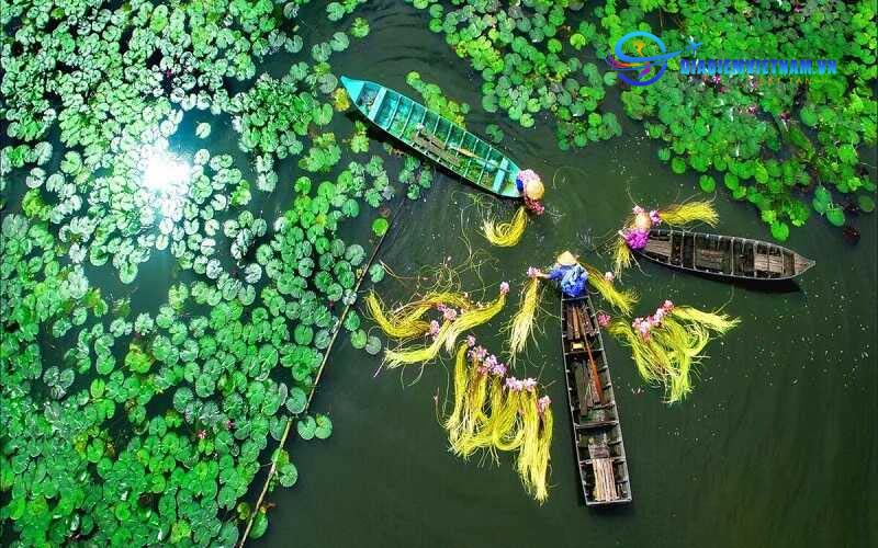 Dưới ánh nắng vàng như mật của miền Tây, mặt nước kênh rạch hiện lên như một tấm gương khổng lồ, phản chiếu sắc xanh bất tận của những tán tràm. Những dải bèo cám xanh mướt trải dài, tạo cảm giác như con thuyền đang lướt đi trên một tấm thảm nhung mịn màng. Khi chiếc xuồng len lỏi qua những rặng tre, rặng điên điển hoa vàng rực rỡ, Thím sẽ thấy "Gáo Giồng" hiện lên như một bộ phim điện ảnh nghệ thuật mà đạo diễn Hồng Sến đã từng say đắm chọn làm bối cảnh cho "Cánh đồng hoang".