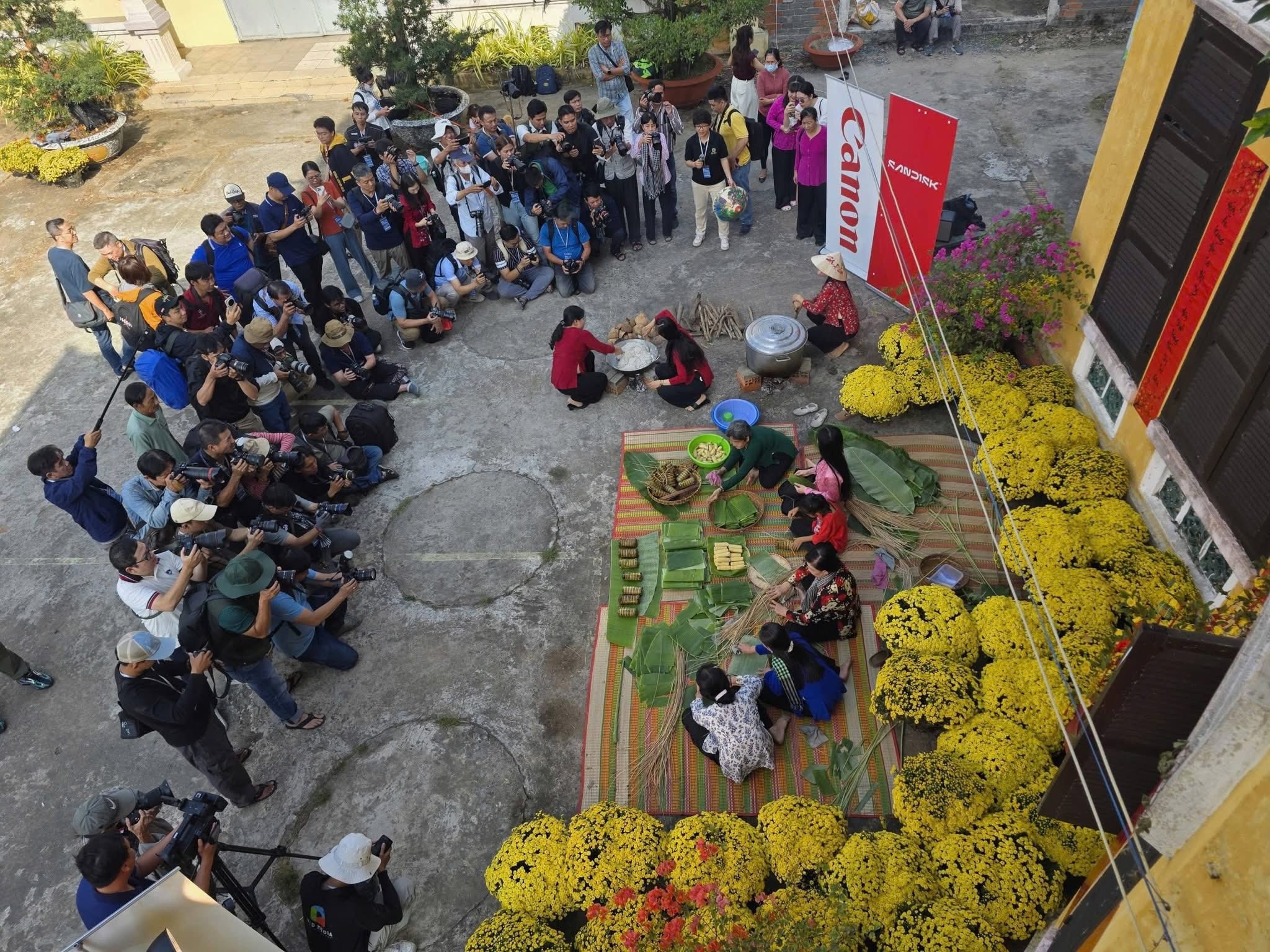 Ở một góc khác, trong sân nhà cổ, những bà, những mẹ ngồi gói bánh, rửa lá, nhóm bếp. Khói bếp quyện với mùi lá dong, mùi nếp mới, mùi hoa cúc ngoài sân, tạo thành hương vị rất riêng của Tết miền Tây. Chung quanh, từng tốp phóng viên, du khách vây tròn, chăm chú ghi lại khoảnh khắc giản dị mà ấm áp ấy.